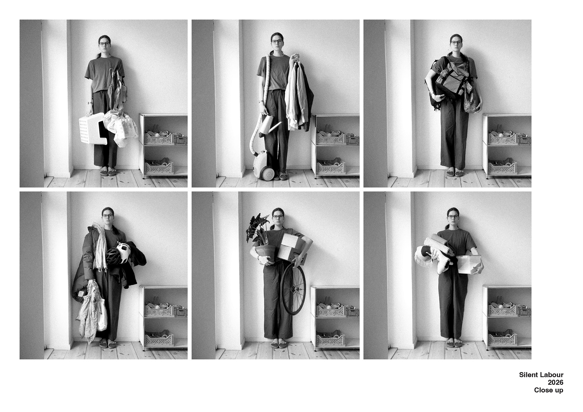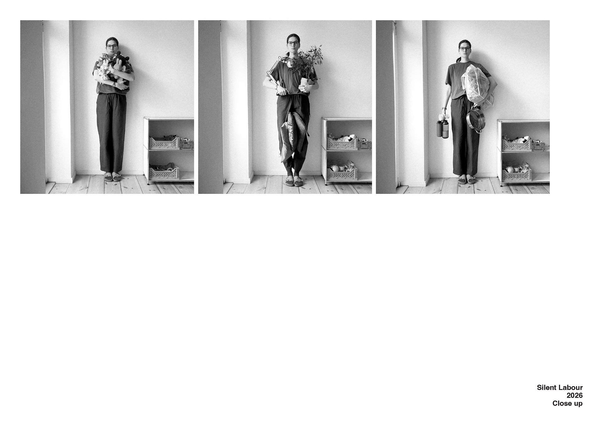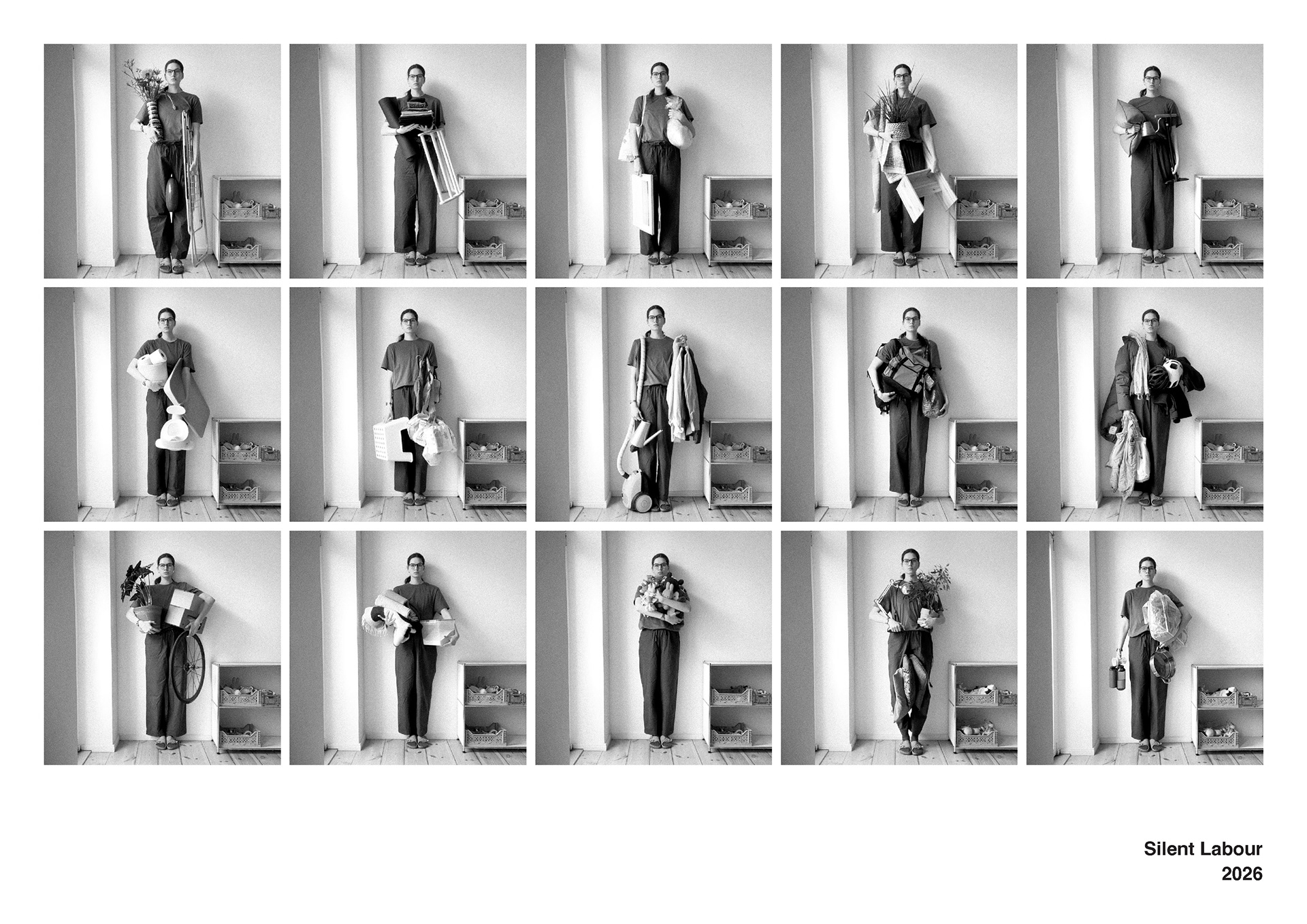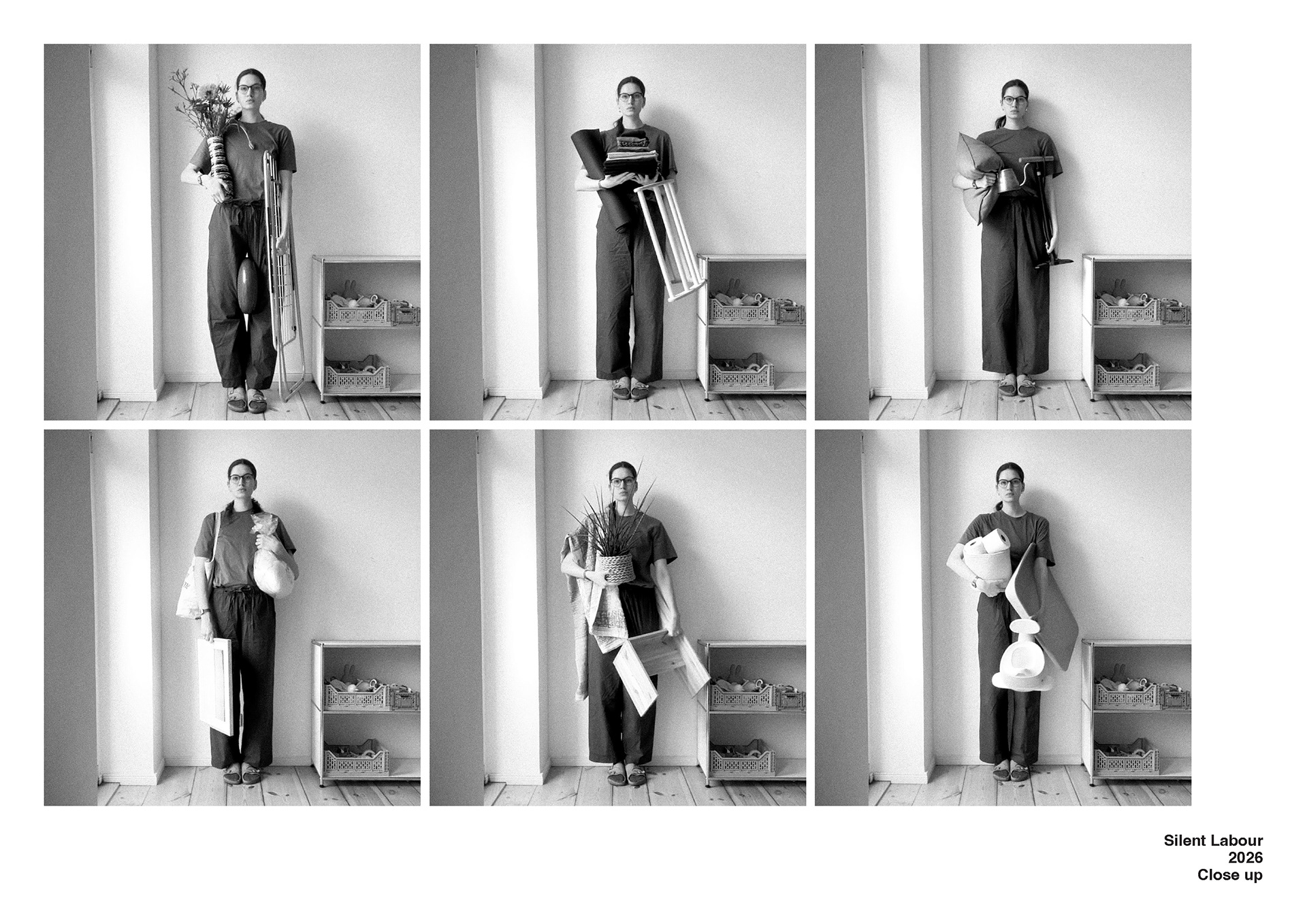This photographic series approaches Gertrud Classen’s Aufbauhelferin not as a historical document, but as an enduring figure — a body that supports, stabilizes, and carries. Where Classen’s women rebuilt physical ruins, this work turns to the interior architecture of the home and asks what forms of reconstruction persist within domestic space. Across fifteen photographs, a woman stands against a wall, facing the camera, holding different objects: a diaper changing table, a potty, pots, pillows, a lamp. These ordinary items function as fragments of an invisible infrastructure. They are traces of care, maintenance, and reproductive labour — the work that sustains daily life. The figure remains still, almost column-like, recalling both monument and support structure. She appears at once contained by the wall and necessary to its stability. The series does not dramatize hardship; instead, it insists on continuity. The home emerges as a site of constant production — of nourishment, comfort, cleanliness, and upbringing — sustained through forms of labour that are largely unpaid and naturalized. By isolating the body and the object against the flat surface of the wall, the photographs construct a typology of support: a visual index of the feminized body as infrastructure. In dialogue with feminist and materialist critiques of social reproduction, the work reflects on how care labour remains structurally undervalued and absorbed into the private sphere. It asks what holds the home together, how such labour becomes invisible, and how photographic representation might shift the politics of attention toward what is usually taken for granted.